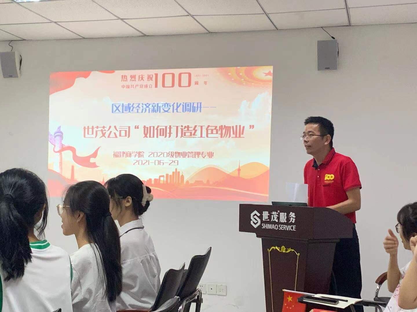奋斗百年路 启航新征程。在建党100周年之际,6月29日,为主动对接国家、区域、行业对物业服务人才的培养需求,必赢官网刘庆华老师把《区域经济新变化》课程搬进社区,带领2020级物业管理学生赴世茂服务福州中心城市公司御龙湾项目开展“红色物业”主题调研。