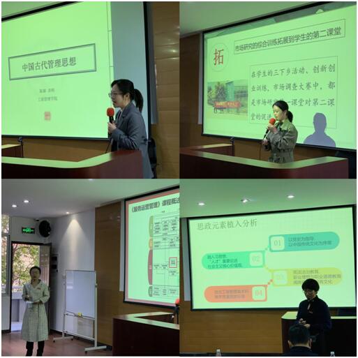 赛前参赛教师们根据比赛要求,编写教案和授课计划表,积极准备。现场说课环节,市场营销系黄美花老师以如何开展市场调查为切入点,让学生深刻体会并融合社会主义核心价值观,培育并践行“诚信经营”“公平交易”“顾客至上”等积极正确的营销价值观。工商管理系陈颖老师结合专业知识点诠释中国管理思想历史的恢宏发展,融入党史学习教育和习近平新时代中国特色社会主义思想,启迪学生爱国热情,突出责任担当。人力资源管理系邓云老师向大家分享了习近平总书记在正定内外招纳贤士,打造“人才九条”的工作经验。工商管理系李冰老师打破服务运营管理与课程思政难以结合的瓶颈,站在学生角度,培养服务意识,并把学生也当做教师的服务对象,体现隐性课程思政特点。最终,陈颖老师以其恰如其分的课堂驾驭能力脱颖而出,获得最高分。
