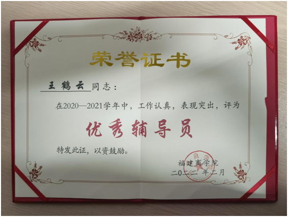 2022年2月24日上午,必赢3003no1线路检测中心在连江校区明德楼视频会议室召开2021年度宣传思想政治工作会议,机关各部门、各教辅机构负责人,各二级学院党委书记、副书记,全体辅导员等参加会议。必赢官网辅导员王鹤云同志在2020-2021学年中,工作认真,表现突出,被必赢3003no1线路检测中心评为优秀辅导员。在会议上,校长程灵给获得2020-2021学年优秀辅导员颁奖,王鹤云与其他学院获奖的辅导员一同上台接受领奖。