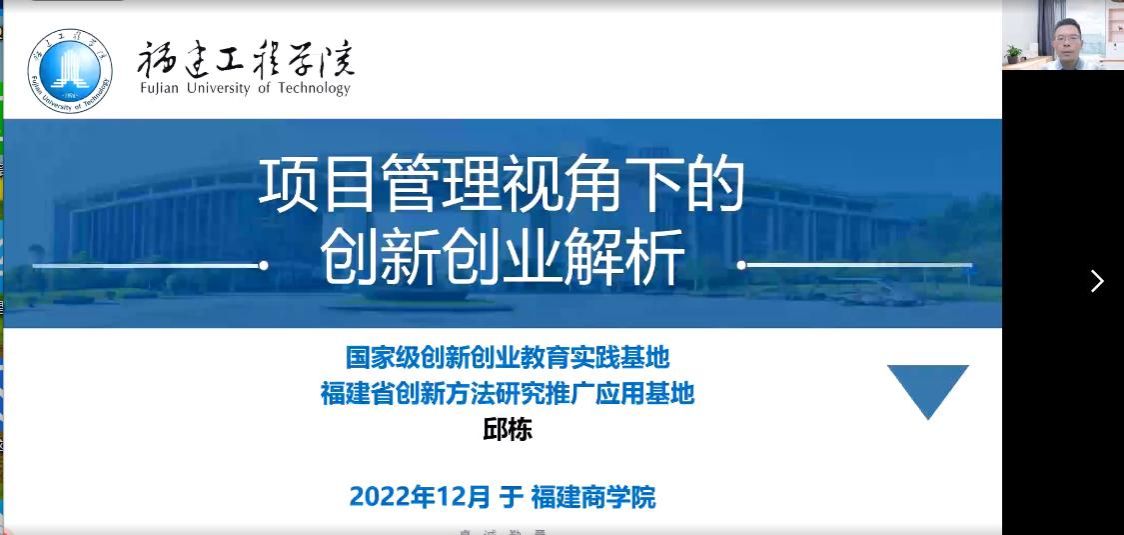 2022年12月6日,必赢官网工商管理系邀请福建工程学院邱栋副教授在线上开展了题为“项目管理视角下创新创业解析”的专题讲座。邱栋副教授为福建工程学院管理学院副院长、硕士生导师,福建省创新方法研究推广应用基地负责人、国家级创新创业教育实践基地骨干、国家级一流本科课程《创新思维与知识创业》骨干、中国技术经济学会复杂科学管理分会理事、国家技术创新方法与实施工具工程技术研究中心创新方法培训师。讲座由工商管理专业负责人陈颖老师主持,工商管理系150余人在线参加了本次讲座。