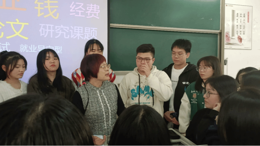 第二部分的导师见面会,各位导师对学生进行分组指导,李冰老师通过学习通的词云对学生们的问题进行收集并展示。学生们找到各自的导师,提出在学习上和生活上遇到的相关问题,各位导师也积极地为学生们答疑解惑,了解被指导学生的情况,包括对专业的想法、学习计划的设定、选课和专业发展规划等进行全面指导,建立联系群,与学生们保持联系。