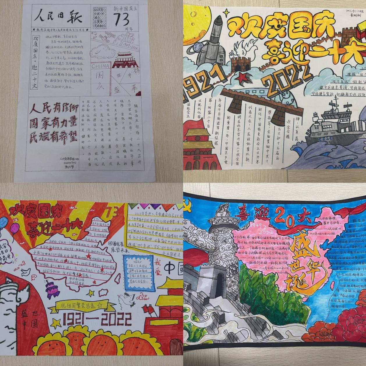 国庆欢度,二十大也召开在即,本次手抄报比赛要求同学们紧扣“欢度国庆,喜迎二十大”这一主题,立意新颖,内容积极向上。绘制完后通过在读书社社群公开投票的方式,评选出一二三等奖,获奖的同学均有奖状以及精美小礼品一份。同学们积极参与了本次比赛,以各色各样的绘画形式展现出永远跟党走的信心和决心,表达对祖国的美好祝福。一撇一捺的认真,独具匠心的“我心向党”,是同学们交出的青春答卷。