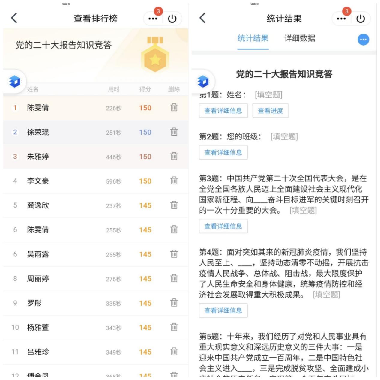 习近平总书记在党的二十大报告中殷切寄语青年:“青年强,则国家强。当代中国青年生逢其时,施展才干的舞台无比广阔,实现梦想的前景无比光明。”青年们是祖国的未来与希望,要始终听党话、跟党走,努力成长为德智体美劳全面发展的社会主义建设者和接班人,将美丽的人生篇章书写在中国式现代化的伟大实践中。 本次知识竞答活动受疫情影响,采取线上的方式进行。题目主要围绕党的二十大报告展开,社员们在深入深入学习贯彻党的二十大精神之后,积极参与作答,在答题过程中,进一步加深认识,用最新的理论成果武装头脑,指导实践,推动工作。
