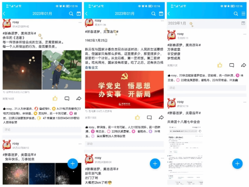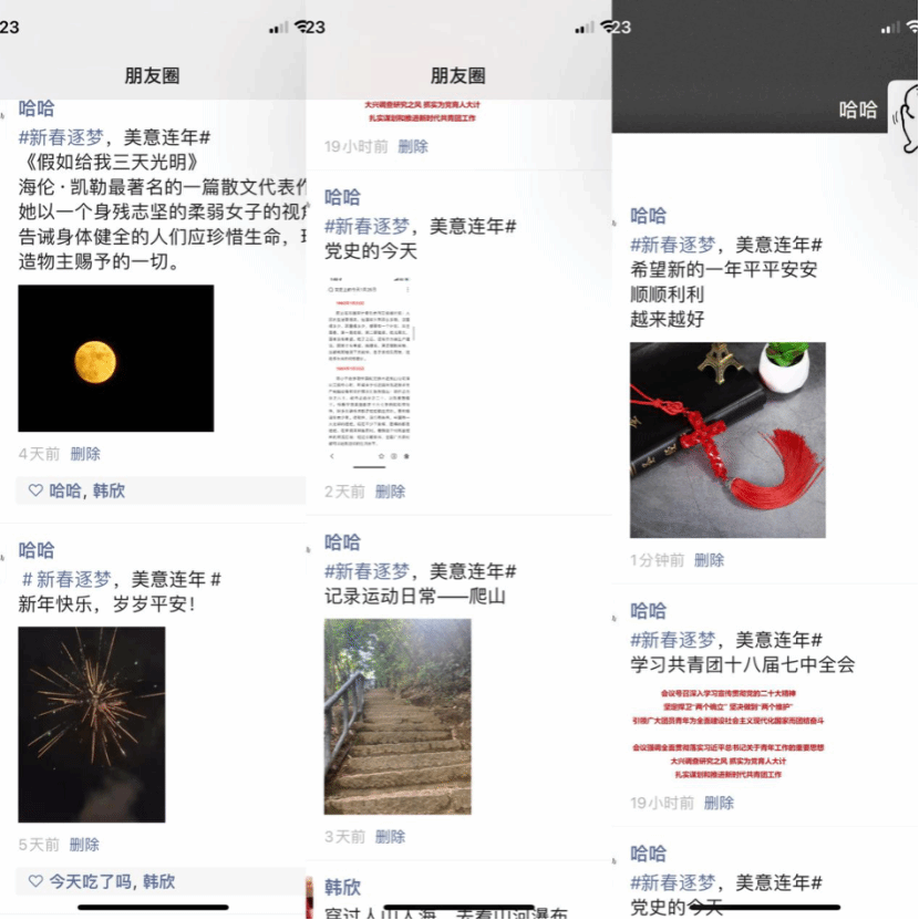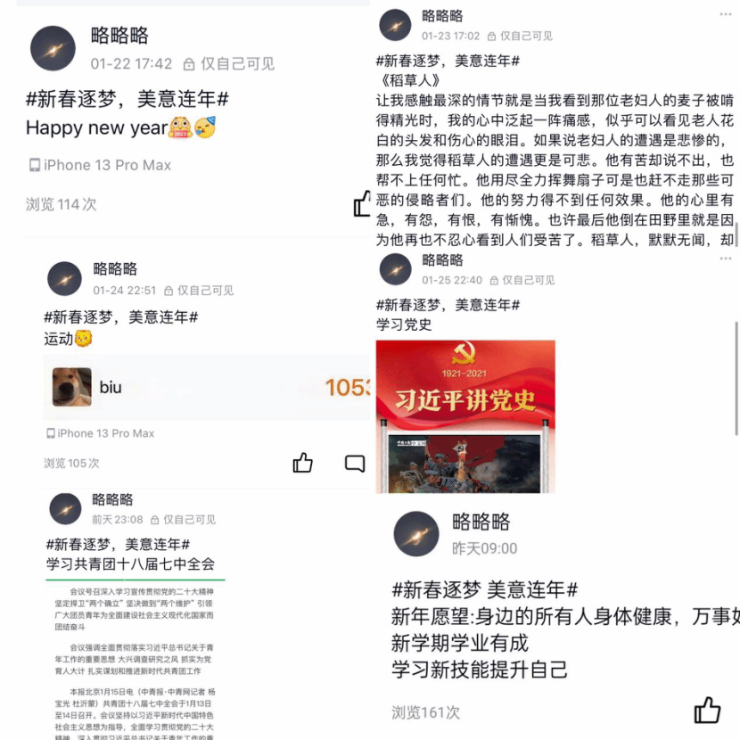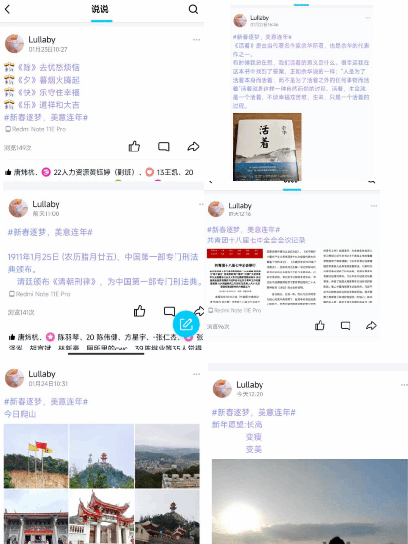 本次打卡活动主要以新年新愿景、晒新书、新气象、学党史、新思想、许新愿六个话题为主,鼓励同学们通过创意十足的线上打卡活动寻年味、送祝福、启新章。广大同学们积极参与活动,以推荐所喜爱的书籍、记录运动日常等形式分享自己的生活。通过学习党史和新思想营造积极学习的浓厚氛围。六个新年话题虽各不相同,但都展示了同学们对新年的期盼和美好祝愿,内容丰富,意义非凡。