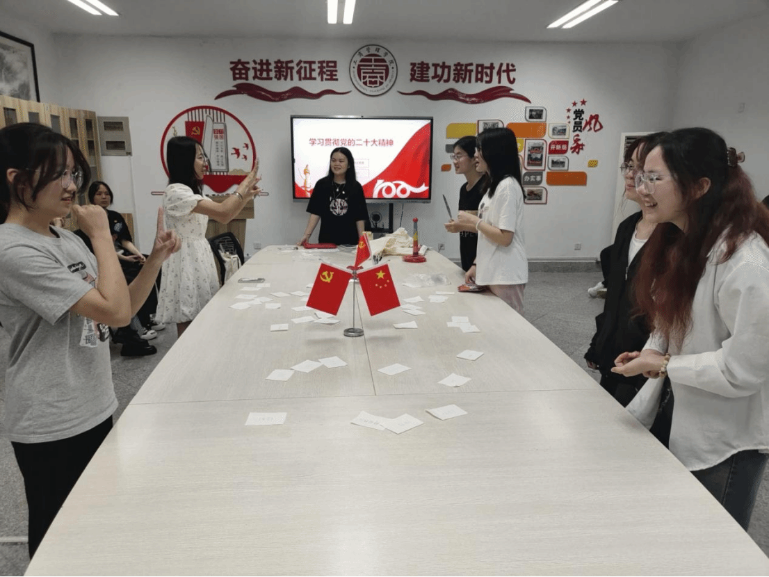 本次活动内容主要分为三部分:一是知识竞赛抢答。围绕党的二十大精神,设置一系列相关知识关卡;二是“青春接力”。以接力的形式进行,每位社员接力回答,补充完整给出的有关党的二十大的内容;三是趣味游戏。通过游戏的方式锻炼社员们的表达能力和团队协作精神。习近平总书记在党的二十大报告中强调:“团结奋斗是中国人民创造历史伟业的必由之路”。团结奋斗是中国共产党和中国人民最显著的精神标识,深刻融入并影响中国人民的精神世界。活动过程中,同学们讲配合、共思考,齐心协力、互相激励,增强了团队凝聚力。