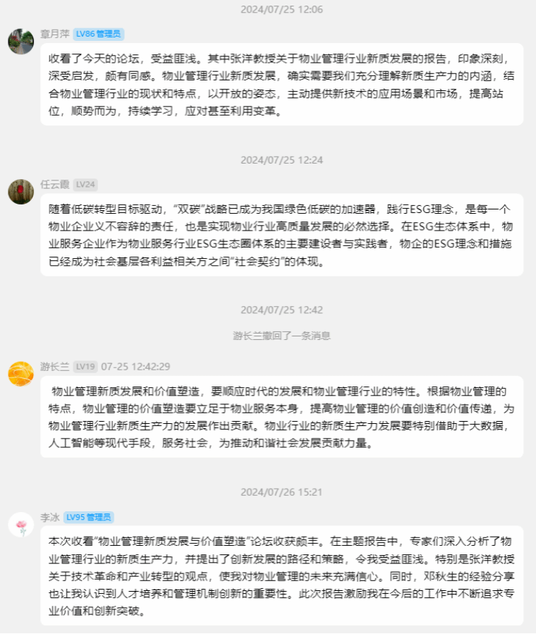 7月25日,第七届物业管理创新发展论坛平行论坛——“物业管理新质发展与价值塑造——第五届物业管理产学研论坛”在北京市首钢会展中心成功举办。本次论坛由中国物业管理协会主办,中国物业管理协会产学研专业委员会承办,旨在深度融合产学研用,共同促进物业管理行业的新质价值塑造。会上,北京林业大学经济管理学院副院长、教授张洋,长沙学院副教授黄蕾,中铁建物业管理有限公司党委书记、执行董事邓秋生,广州广电城市服务集团副总经理王兆春分别作《物业管理行业新质发展释解与思考》《困局中的物业管理如何驶向专业价值新境界》《深化创新改革推动行业新质发展》《物业服务专业价值新思考》的主题演讲。