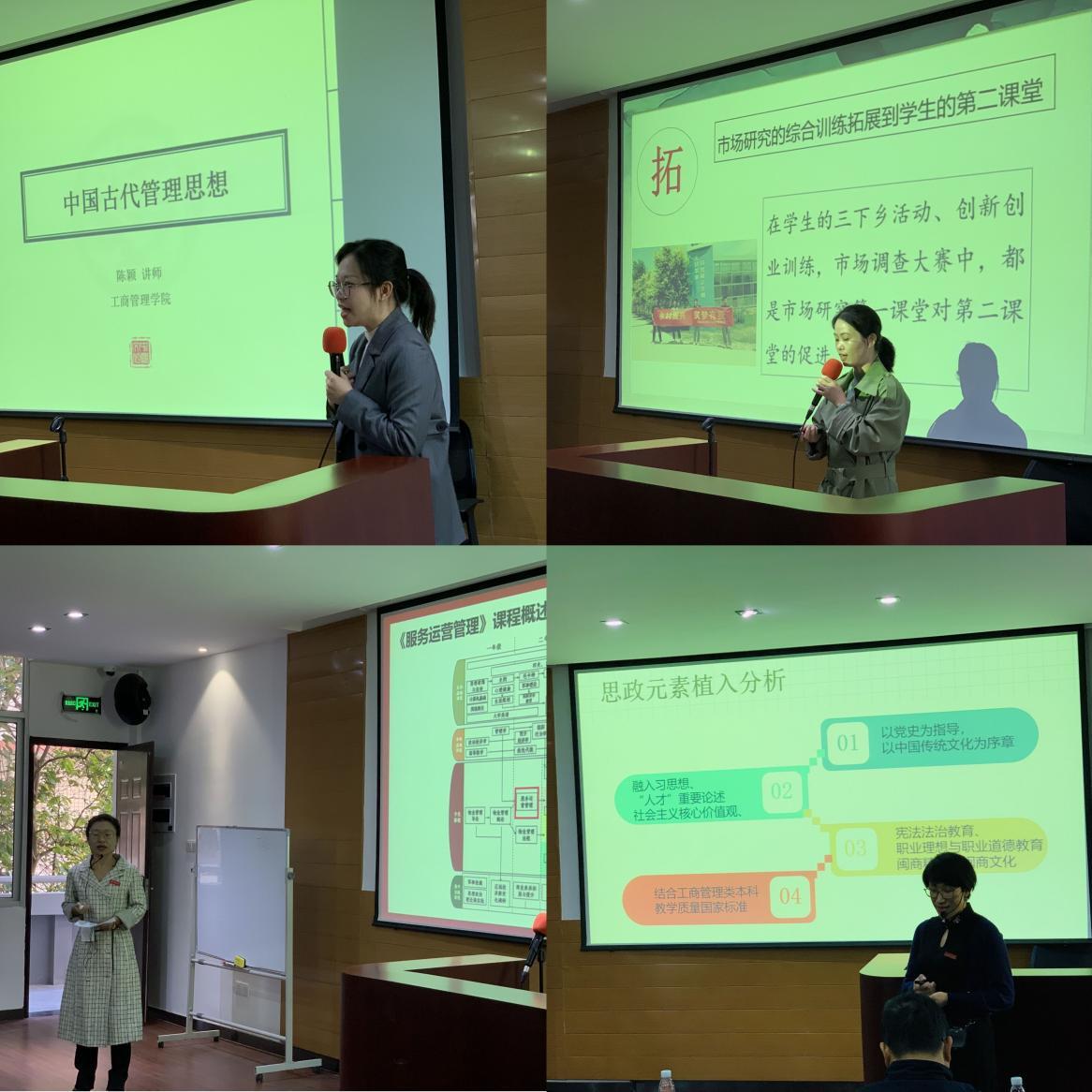 赛前参赛教师们根据比赛要求,编写教案和授课计划表,积极准备。现场说课环节,市场营销系黄美花老师以如何开展市场调查为切入点,让学生深刻体会并融合社会主义核心价值观,培育并践行“诚信经营”“公平交易”“顾客至上”等积极正确的营销价值观。工商管理系陈颖老师结合专业知识点诠释中国管理思想历史的恢宏发展,融入党史学习教育和习近平新时代中国特色社会主义思想,启迪学生爱国热情,突出责任担当。人力资源管理系邓云老师向大家分享了习近平总书记在正定内外招纳贤士,打造“人才九条”的工作经验。工商管理系李冰老师打破服务运营管理与课程思政难以结合的瓶颈,站在学生角度,培养服务意识,并把学生也当做教师的服务对象,体现隐性课程思政特点。最终,陈颖老师以其恰如其分的课堂驾驭能力脱颖而出,获得最高分。