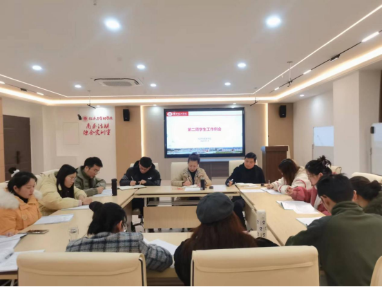 书记助理叶赵强就晚自习值班制度、新学期活动策划级就业等相关工作进行布置。重点布置就业工作要求就业岗位每周一推送、辅导员访企拓岗的相关工作安排、做好精准帮扶工作、3月中下旬春季专场招聘会未就业学生应回尽回;认真核对毕业生上传就业协议的规范性等。重点布置考研学生复试的指导工作、春季征兵的宣传工、精准开展三支一扶的工作。