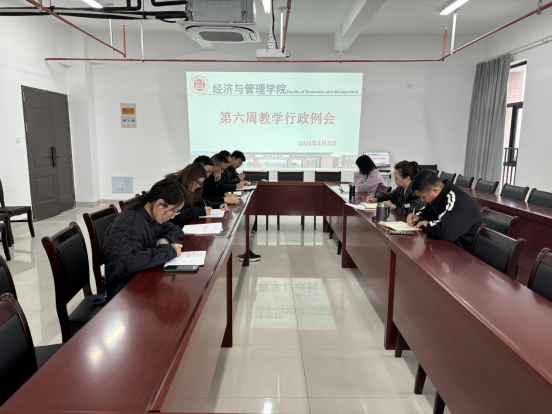2024年4月3日,经济管理学院在新行政楼725召开第六周教学行政例会,会议由院长吴玲主持,副院长秦品德、院长助理张珊、实训中心主任及各教研室主任参加会议。