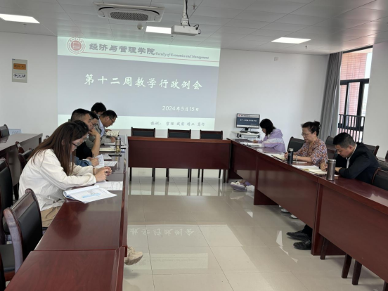 2024年5月15日,经济管理学院在新行政楼725召开第十二周教学行政例会,会议由院长吴玲主持,副院长秦品德、院长助理张珊、实训中心主任及各教研室主任参加会议。