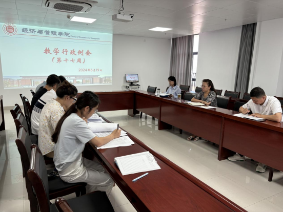 2024年6月19日,经济管理学院在新行政楼725召开第十七周教学行政例会,会议由院长吴玲主持,副院长秦品德、院长助理张珊、实训中心主任及各教研室主任参加会议。