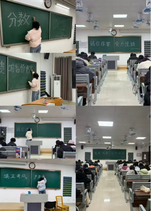 与此同时,院学生会组成书写员与拍照记录员,在考试教室黑板上精心撰写诚信考试标语。“分数诚可贵,诚信价更高”“诚信作答,实力说话”等醒目标语,让每一间教室都成为诚信教育的生动课堂,营造出“零作弊、守诚信、比学风”的环境。
