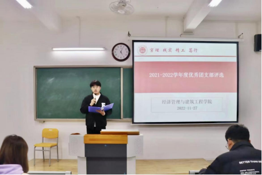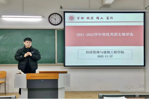 为贯彻落实学校下发的《关于做好Beat365唯一官方网站2021-2022学年度“优秀团支部”评选工作的通知》有关“优秀团支部”评选的文件精神,弘扬“党有号召 团有行动”的优良传统,展现团组织的向心力、凝聚力、战斗力。深入学习贯彻习近平新时代中国特色社会主义思想,激励学生刻苦学习、争优创先。经济管理与建筑工程学院于2022年11月27日,在一教215室开展2021--2022学年度“优秀团支部”评选活动。学院本着“公平、公正、公开”的原则,成立了由书记助理、团总支书记叶赵强、经济学学生支部书记、团总支副书记员禹辛、团总支组织委员、辅导员王绎程、团总支宣传委员、辅导员张雨停、团总支委员张晏五人组成评委小组,制定了考评标准。“优秀团支部”宣讲评选活动由院学生会宣传部部长韩大壮主持,2022级各班团支书到场学习观摩。