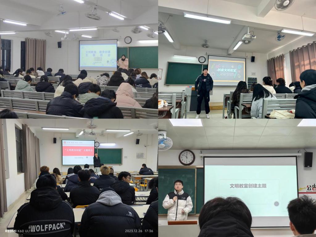 对照标准积极创建(12月15日-12月22日):针对前期发现的问题,首先各班级辅导员通过主题班会形式,增强同学们“文明教室,你我共建”的理念;其次各班级成立班委督察小组,每天早上8点前在到教室检查卫生并在教室门口督促学生不带餐进教室;各班生活委员合理安排值日小组,每天两打扫(中午11:30,晚上8:30),确保学生有个舒适的学习环境;最后由班级班委,团员、入党积极分子和党员带头上课前排就坐,并将手机放入手机袋内,以点带面提高课堂学习质量,形成班级良好的班风学风。