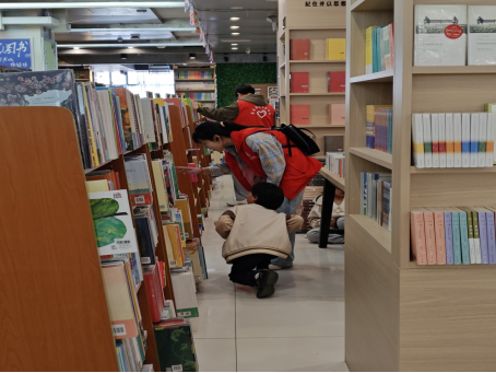 活动伊始,志愿者们围绕“我是‘图书管理员’”主题,开展志愿实践。上午9:30,数十名来自经管学院的志愿者在新华书店工作人员指导下,系统学习图书分类方法与读者服务流程,随后分组进行书架整理、环境清洁与阅读引导等工作。他们认真整理书籍,主动协助读者高效找书,并向读者推荐经典书单、分享阅读感悟。在“一人一段”经典接力朗读中,书香温情在字里行间流淌,志愿精神在服务中熠熠生辉。