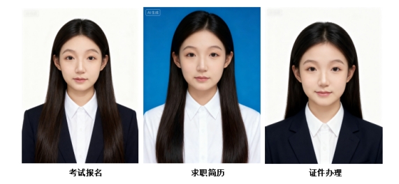 内容设计聚焦学生需求,提供全流程个性化服务:学生可自主选择AI工具,自定义证件照尺寸、背景色,生成后能即时下载,解决传统证件照耗时、耗力、成本高的问题;还特别推出“分场景定制”功能,内置“求职简历”“考试报名”“证件办理”三大模板,可自动适配不同场景的尺寸与背景要求,无需反复调整即可获取合规证件照。