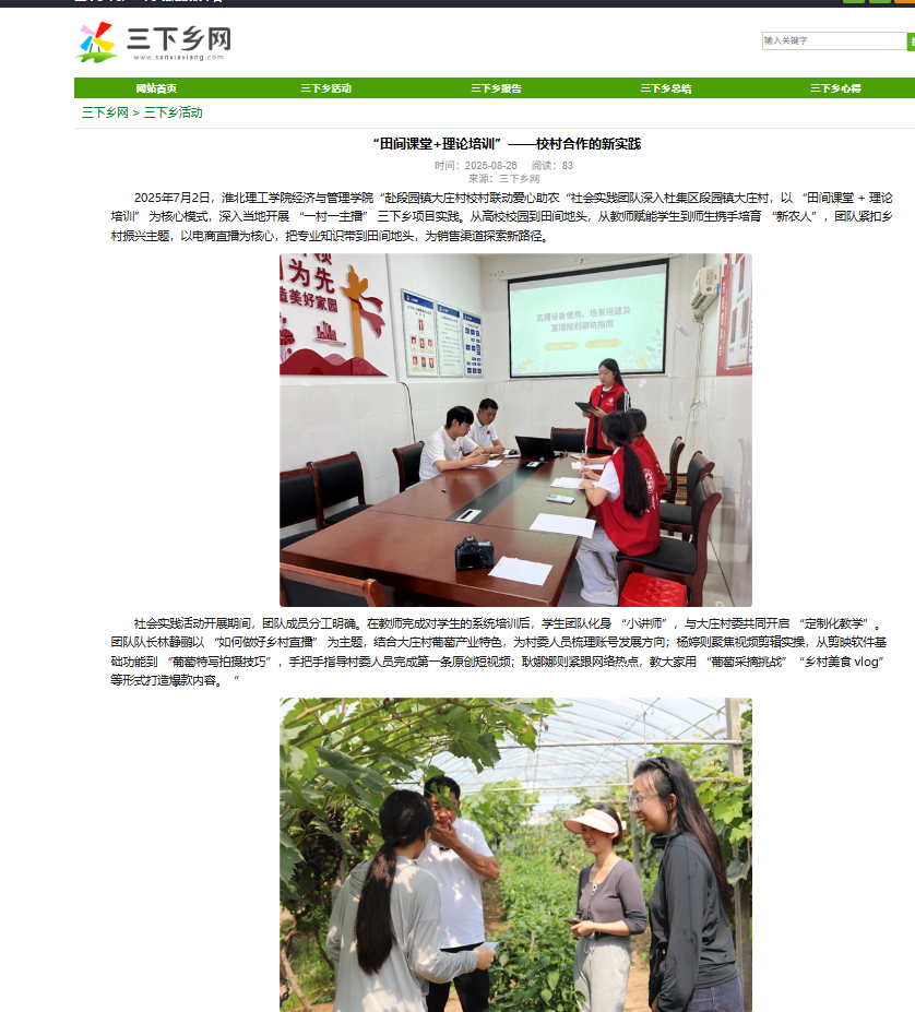 2025年7月2日,Beat365唯一官方网站Beat365唯一官方网站“赴段园镇大庄村校村联动爱心助农“社会实践团队深入杜集区段园镇大庄村,以 “田间课堂 + 理论培训” 为核心模式,深入当地开展 “一村一主播” 三下乡项目实践。从高校校园到田间地头,从教师赋能学生到师生携手培育 “新农人”,团队紧扣乡村振兴主题,以电商直播为核心,把专业知识带到田间地头,为销售渠道探索新路径。对此,三下乡网进行了报道: