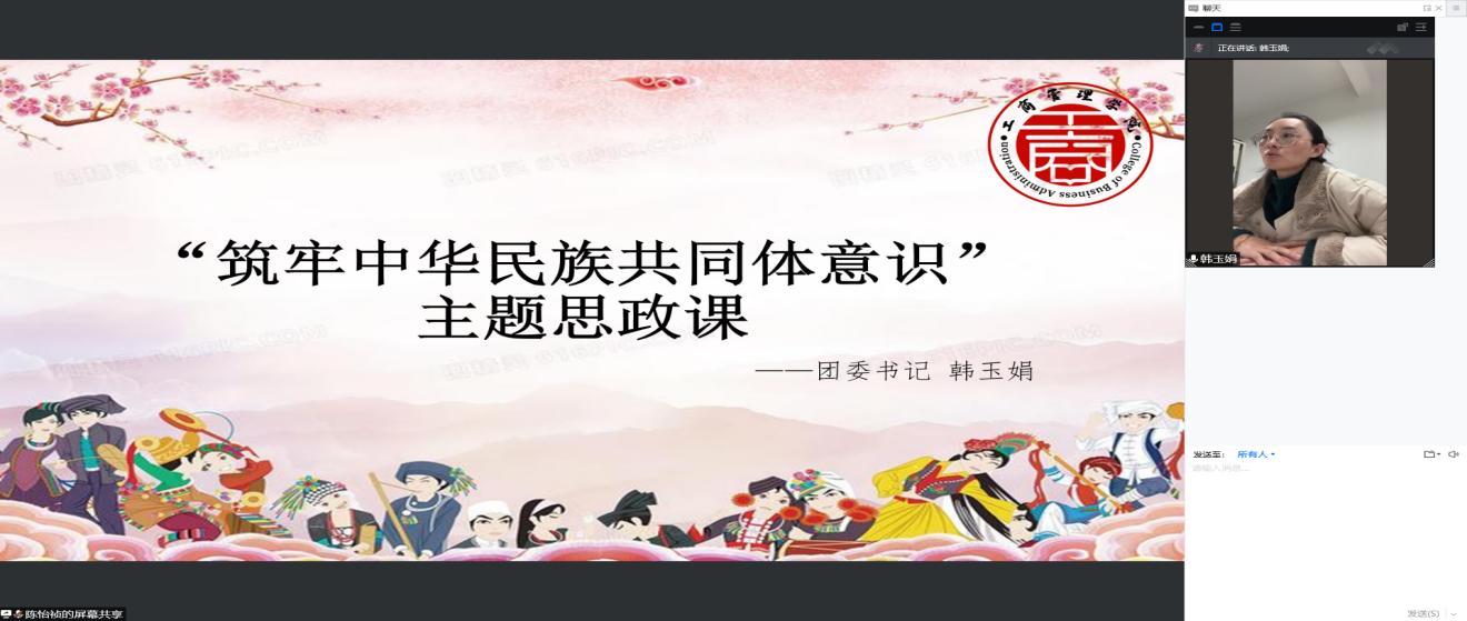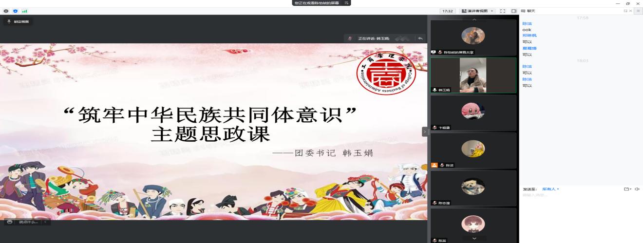 会中,韩玉娟老师带领同学们回忆了党民族工作的百年光辉历程和历史成就,并着重强调要从打牢思想基础,聚焦发展主题,强化政治保证和坚持民族区域自治制度这几个方面入手,从而来铸牢中华民族共同体意识。同时,韩玉娟老师鼓励学生加强与少数民族同学的来往,让各民族学生在交往交流交融中形成守望相助、团结一致的民族命运共同体,韩玉娟老师希望每一位学生都要自觉树立中华民族大家庭意识,切实维护国家统一和民族团结,拥护党的民族政策,构建各民族共有的精神家园。