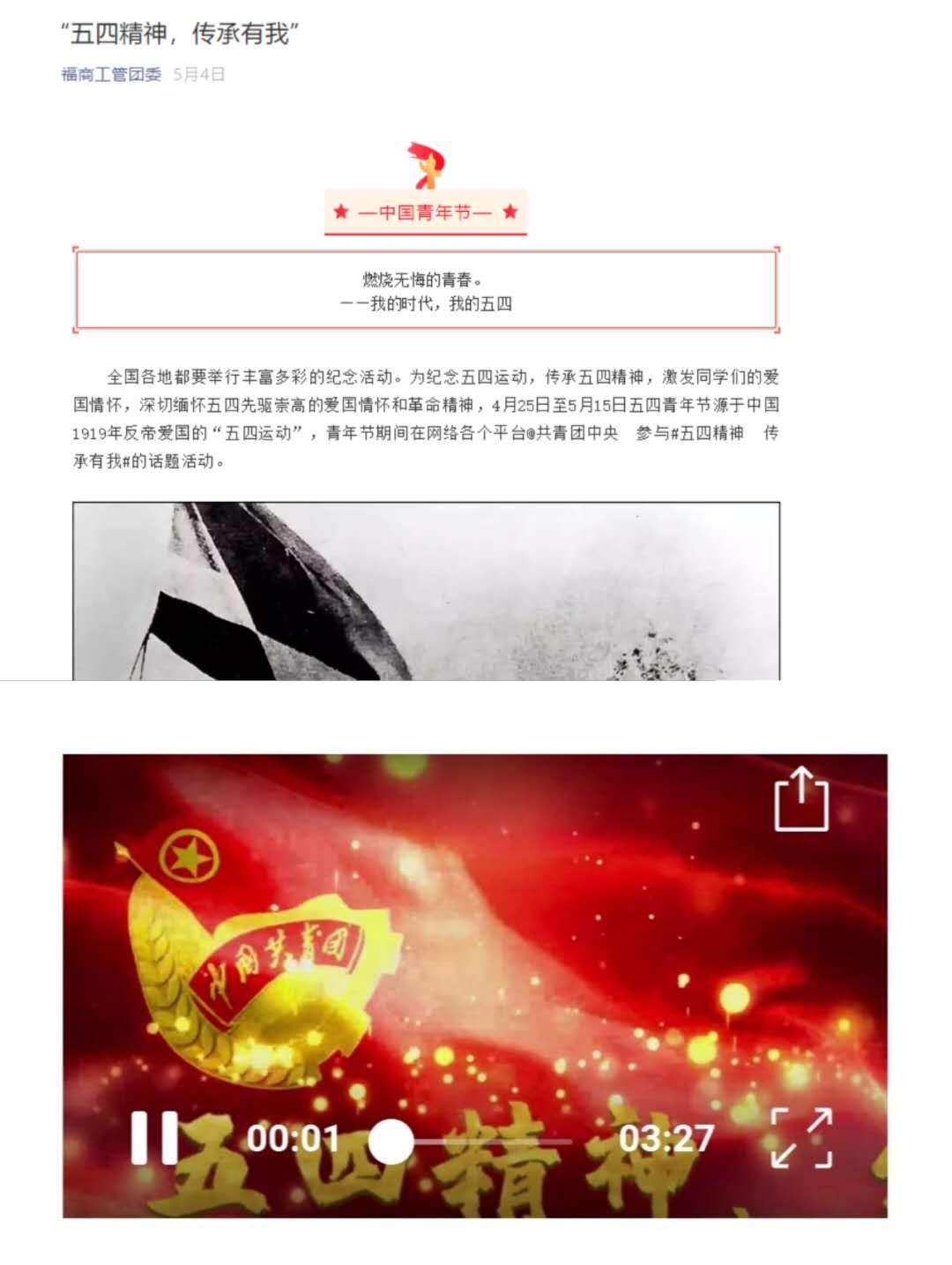 录制“五四精神,传承有我”主题视频以及公众号推文。必赢3003no1线路检测中心全体干部编辑录制“五四精神,传承有我”视频,获得学院的一致好评,公众号推文包括对此次活动的全方面推送,同时也对五四精神进行了解读,对师生代表的学习心得进行推送,充分营造众志成城、团结一心战胜疫情的浓厚氛围。同时也激励了同学们更加紧密地团结在以习近平同志为核心的党中央周围,进一步坚定制度自信,不忘初心、牢记使命,不惧风雨、勇挑重担,为夺取新时代中国特色社会主义事业伟大胜利、实现中华民族伟大复兴的中国梦凝聚起强大青春力量。
