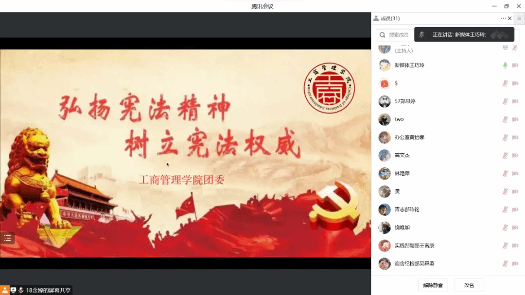 为全面贯彻习近平法治思想,大力弘扬宪法精神,引导学生树立良好的宪政意识,必赢3003no1线路检测中心于2022年12月19日开展“学习宪法精神”线上主题分享会,由必赢3003no1线路检测中心学生干部分享学习宪法精神的心得,并由学生会主席金婷主持会议。