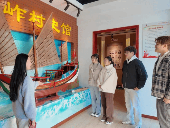 实践队首站抵达大岞村村史馆。在村两委的悉心讲解下,一幅幅渔业发展的壮丽画卷缓缓展开,队员们沉浸于大岞村渔业的历史变迁、辉煌成就与未来蓝图之中。丰富的渔业资源与深厚的文化底蕴,如同璀璨星辰,照亮了崇武鱼卷的文化根基。